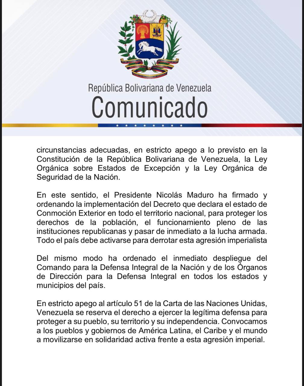 En estricto apego al artículo 51 de la Carta de las Naciones Unidas, Venezuela se reserva el derecho a ejercer la legítima defensa para proteger a su pueblo, su territorio y su independencia. Convocamos a los pueblos y gobiernos de América Latina, el Caribe y el mundo a movilizarse en solidaridad activa frente a esta agresión imperial.